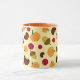 This orange coffee mug features a colourful autumn harvest pattern with pumpkins, cranberries, acorns, and chestnuts on a beige background. Great gift for fall and Thanksgiving!