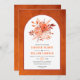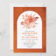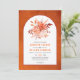 This wedding design has a stunning autumnal look, with a burnt orange stained background and an arch shaped frame. Inside the frame, there are beautiful dalia and rose flowers, lush foliage, and pampas grass. It is the perfect combination to create a warm and inviting wedding invitation.