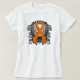 Orange ribbon with angel wings and filigree pattern. The orange ribbon stands for Multiple Sclerosis Awareness in March, Self Injury Awareness in March, Melanoma Awareness in May, Skin Cancer Awareness in May, Leukaemia Awareness in September, Cultural Diversity Awareness in October, Hunger Awareness in October, Lupus Awareness in October, RSD/CRPS in November, as well as Feral Cats Awareness, Agent Orange Awareness, Motorcycle Safety Awareness, and Racial Tolerance Awareness.