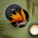 Round, magnetic bottle opener that features the photo image of an orange bloom of the tropical Bird of Paradise Plant printed on a black background along with the word ALOHA printed in light pink, stylised lettering. Also referred to a a Crane Flower. A lovely, floral design!