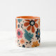 An stylish pattern of orange, black, teal and pink flowers on a beige background. Whether you're looking for a gift for a friend or just want a new mug for yourself, this is the perfect choice.
