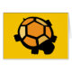 front of card is decorated with an orange and black turtle design with yellow background, inside of card is blank.