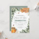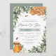 Elegant and whimsical bee themed bridal shower invitations feature a border of lush green botanical foliage, white orange blossom flowers, honeycombs and a jar of honey with buzzing honeybees. "Please join us for a baby shower honouring the mama to bee" appears in the centre, with your baby shower details beneath in soft grey lettering.