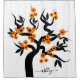 Orange and black love birds sakura cherry tree with blossoms shower curtain. It features a black sakura tree with orange flowers with black hearts in the centre and a pair of love birds. Your name is written in a script style font.