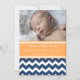 Customisable magnetic birth announcement photo template card in chic and modern dark navy blue, orange and white retro chevron zigzag stripes pattern.