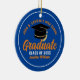 This modern orange and blue custom senior graduate Christmas ornament features your high school or college name for the class of 2025. Customise with your graduating year under the chic handwritten script and black grad cap for a great personalised graduation gift.