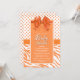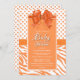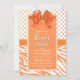 An orange and white baby shower invitation featuring a festive bow, polka dots, and zebra stripes while the text is framed with a faux glitter border.
