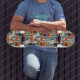 This vibrant skateboard design features striking orange California poppies set against a backdrop of bold black stripes with tiny polka dots. Accented with delicate little white, black, and blue flowers, this board exudes a unique blend of floral beauty and edgy style, perfect for skaters who love a bold, nature-inspired look.