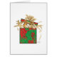 Orange tabby cat popping out of a Christmas holiday gift box covered with red and green kitty scratched paper, gold ribbon, and bow. Art of Margaret Loftin Whiting.