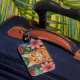 Luggage tag with a cute orange cat with folk art red and pink flowers.