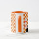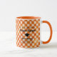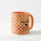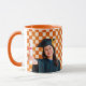 Personalized portrait mug for a graduation with an orange checkered pattern on the background and the class, the graduate's name, degree, university name, and a grad cap design on the back. To create a cut-out, crop your image to the desired subject and use the "remove background" tool.