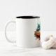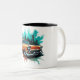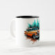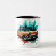 Fuel your morning with bold style. This ceramic mug features a fiery orange Chevy with splashes of turquoise paint and an urban city skyline. A great gift for muscle car lovers and retro design fans alike.