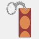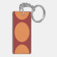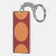 This bold geometric pattern features a large orange dot in the centre and two orange half circles on the edges of a red background.