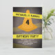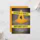 Construction birthday theme featuring an illustration of an orange cone with yellow caution tape over a grey background. Personalise all text. Opposite side is orange.