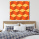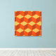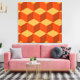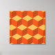 The design features an interlocking pattern of bright orange cubes. It could be seen as reminiscent of the art of M.C. Escher, but it simply uses basic geometric forms to achieve an attractive and elegant effect. It looks like an endless staircase in various shades of orange.