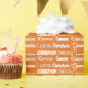 Cute orange name collage wrapping paper for a birthday party or baby shower decorated in nine different fonts spelling a custom name in white. Cute personalised kids gift wrap with fun typography in white.