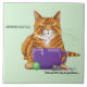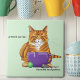 A cute orange tabby cat sitting in front of a purple mug of coffee in a background of green