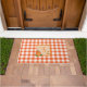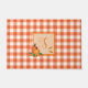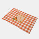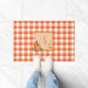 A fall doormat with an orange and white check pattern , two pumpkins and autumn leaves . Personalise it with your last name initial . Also available in black and white .