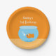 Whimsical and cute kids birthday party paper plates with an orange and blue goldfish design that has a yellow fish in a fish bowl, personalised with any name.