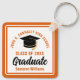 These modern orange and white custom graduate keychains feature classy typography of your university or college name for the class of 2025. Customize with your graduating year next to the chic handwritten script and black grad cap for a great personalized congratulations graduation gift.