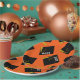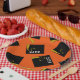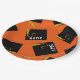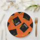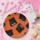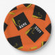Creative orange graduation party plates featuring black and gold graduation caps. To personalise edit text to add name of grad and senior class year.