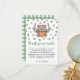Gender neutral bear themed baby shower thank you card with a hand drawn illustration of a teddy bear and greenery surrounded by little stars. Green and orange baby shower thank you flat card with a teddy bear theme. Teddy bear baby shower thank you card in green, orange, and yellow with stars and a bear. Green gender neutral we can bearly wait themed baby shower thank you card with a printed thank you note.