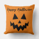 The perfect Halloween decorative pillow featuring a Jack o Lantern pumpkin face in black on an orange background, with the words "Happy Halloween" on top.