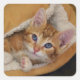 An orange and white tabby kitten is tucked into an orange corduroy bed. His blue eyes sparkle. Is he saying good night? Or is he waiting for you to nod off so he can prowl around?