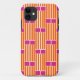 This phone case has a mid-century modern design of orange vertical lines with pink rectangles above repeated over the design.
