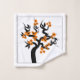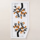 Orange love birds sakura cherry tree with blossoms and black border bath towel set. It features a black sakura tree with orange flowers with black hearts in the centre and a pair of love birds. Your name is written in a script style font.