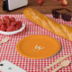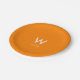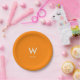 Trendy personal party paper plates featuring orange background, large centred monogram and associated name. Clean, simple minimalist typography. Fully personalizable.