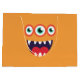 An orange monster face with three green eyes and toothy smile. Cute bag for any party!