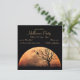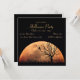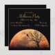 Big, bright, full orange moon with the silhouette of a broken fence, tree, and cat.