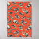 This poster features hand-illustrated dinosaur skulls in navy blue and cream on a bright red-orange background.