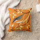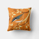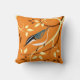 Decorative pillows with stylised bird art of a Nuthatch on branch swirls and an orange background with leaf pattern