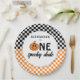 Orange One Spooky Dude Personalised Halloween 1st Birthday Party Paper Plates - Celebrate your little dude's big one in a spooky and fun way this Halloween season with this cute orange and black chequerboard retro smiley face pumpkin 1st Boo-Day Party theme for boys. Featuring black and white chequerboard and orange and white chequerboard, classic Halloween colours. A smiley face pumpkin with lightning eyes adds to the fun, retro spooky season aesthetic. Elevate your party decor with personalised birthday paper plates! All text is editable.