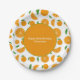 Paper Plates with a slice, half and full orange pattern. A customisable text is available at the centre on an orange background. A fresh decoration for a birthday party, a wedding, a housewarming party, a retirement, a bachelorette party, etc.