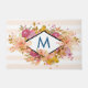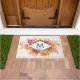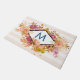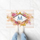 A doormat with a monogram initial. Designed with a peach and white striped pattern. Layered over top is an orange and pink floral arrangement with green leaves. A diamond shaped frame layered over top with your personalised monogram letter inside.