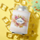 A can cozie with a peach and white striped pattern. Layered over top is an orange and pink floral arrangement with green leaves. A diamond shaped frame layered over top with your personalised text inside.