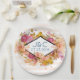 Wedding paper plates with a peach and white striped pattern. Layered over top is an orange and pink floral arrangement with green leaves. A diamond shaped frame layered over top with your personalised text inside.