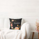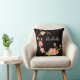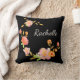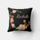 Throw pillow featuring a black background with orange pink and green flowers and a custom first name monogram