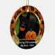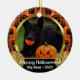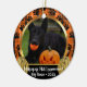 This adorable pet photo ornament features orange plaid, pet paw prints, and gold glitter pumpkins! Simply add your photos, pet name, family name, message, greeting, and/or year on both sides.
