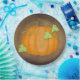 Orange pumpkin graphic with polka dot leaves on textured brown background.