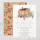 This cute "a little pumpkin on the way" virtual/online/zoom/facebook baby shower invitation features an orange pumpkin with dahlias red gerbera on a white background. The reverse side features a light orange background with autumn/fall leaf patterns. Personalise it for your needs. You can find matching products at my store.