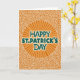 This greeting card centers on a bright orange circle like a stylized sun, with straight rays shooting outward to set a lively St. Patrick’s Day scene. Inside that circle, the words “HAPPY ST. PATRICK’S DAY” sit across three lines in teal green letters, edged with a thin white glow that helps them stand out. The warm orange tones feel like an open invitation, while the cool green type adds that classic holiday nod 💚. Around the center, a deeper orange background is filled with fine white swirls that echo Celtic knotwork, giving the design a close, intertwined feel, like friends leaning in for a photo ☘️. The mix of sharp rays and curling lines creates a push-and-pull that reads like cheerful energy meeting gentle connection. The message stays firmly in the middle, framed by the rays so your eyes land on the greeting first and then wander outward. Behind it all, the white linework forms looping, lace-like patterns across the orange field.