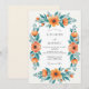 This botanical design features a vibrant arrangement of watercolor poppies and ranunculus in shades of orange and peach. The lush foliage is rendered in a soft dusty teal and deep forest green, creating a striking contrast. Ideal for a fresh spring or summer seasonal event, the artwork evokes a sense of airy romance and natural beauty.