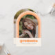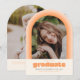 This fun retro inspired graduation announcement features space for a single photo on the front framed by an arch in shades of orange. It also has space for the graduate's name, school, and class year. The back of the announcement has space for a second photo and more text.