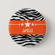 Trendy and modern Sassy Star Zebra Button featuring a chic black and white zebra print background and a bold orange border adorned with a fun star motif. This girly design may be customised with the personalised text of your choosing. Click "Customise It" to find more personalisation options.
