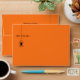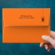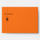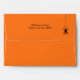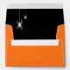 Spiders dropping from single threads of spider web all over an orange envelope with a custom printed return address and creepy "open if you dare" editable wording on the front. The inside features a printed design in black and white with more dangling spiders, and the colour on the outside is editable to match your Halloween party invitations or cards, just pick any colour you want on the template editor.