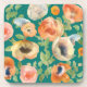 Colourful watercolor and pastel orange, white and pink anemones, poppies, roses and other spring flowers with pale green leaves on a turquoise background.